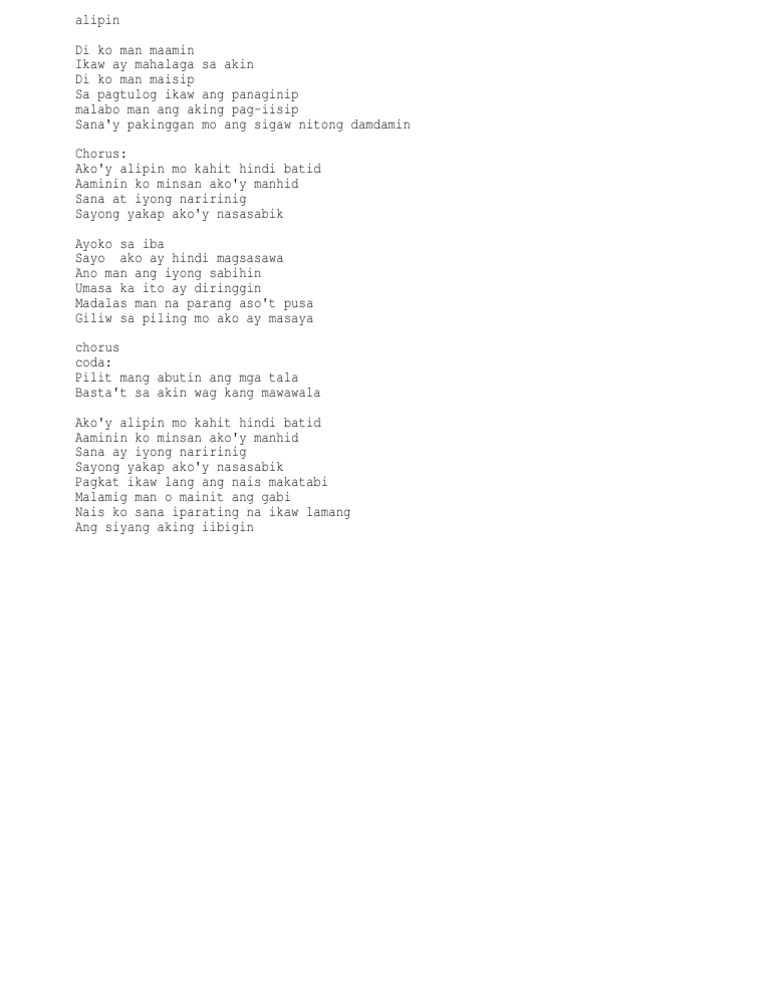 Chorus Akoy alipin mo kahit hindi batid. 10042007 Akoy alipin mo kahit hindi batid Aaminin ko minsan akoy manhid Sana ay iyong naririnig Sayong yakap akoy nasasabik. Pagkat ikaw lang ang nais makatabi.
